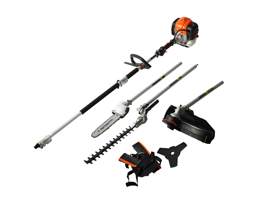 Inclus : Harnais, tête débroussailleuse nylon, disque débroussailleuse, tête taille-haies, tête de taille avec guide-chaîne et chaîne incluses.